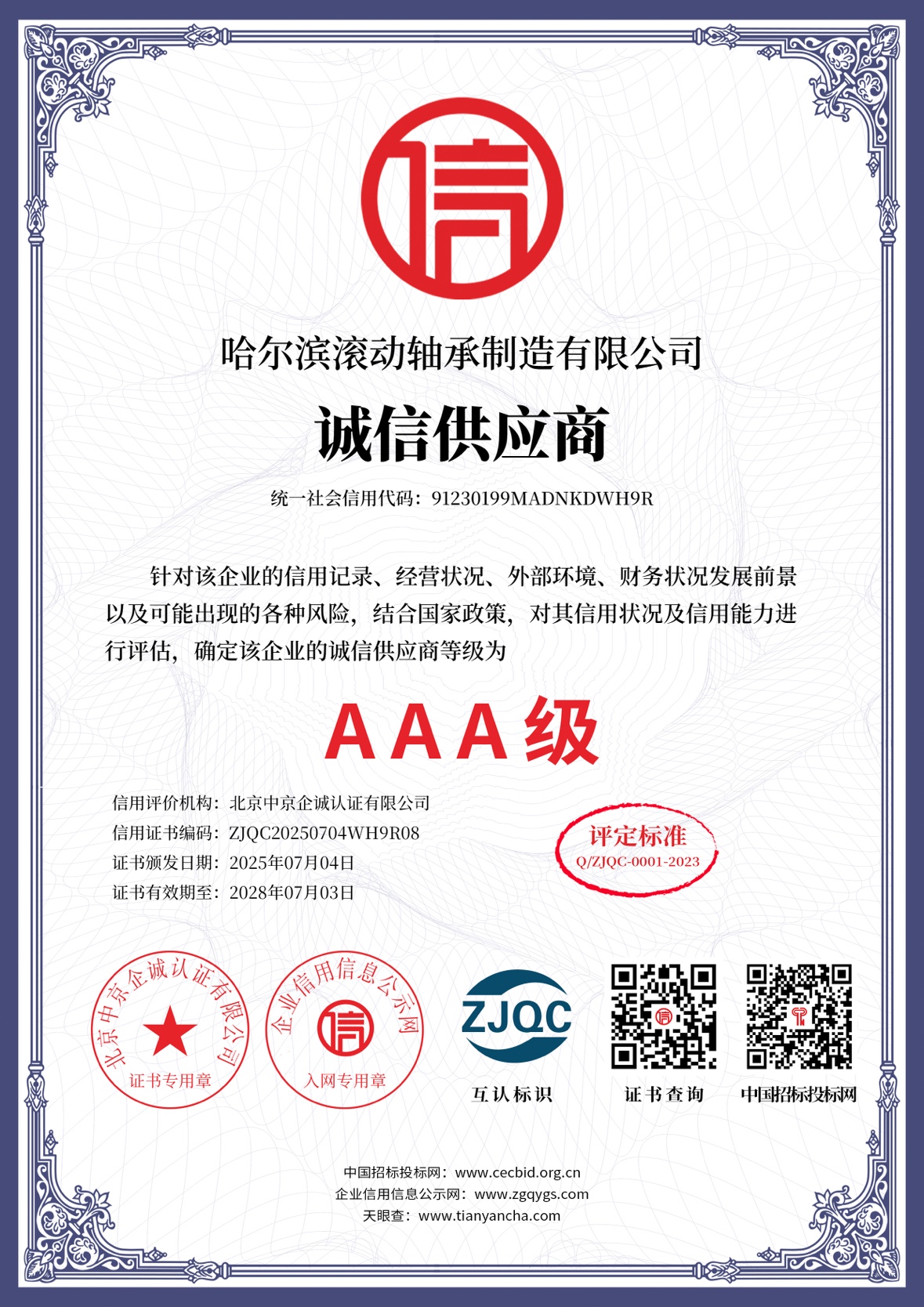 信任是合作的基石,守信是立业的根本。这九项AAA级荣誉认证,不仅是一份荣誉,更是一份激励与鞭策。它见证了公司在诚信经营道路上的不懈努力,也承载着社会各界对我们的高度认可与殷切期望。未来,哈尔滨滚动轴承制造有限公司将以此次荣誉为新起点,持续深化诚信体系建设,不断提升产品质量与服务水平,以更加饱满的热情、更加严谨的态度、更加优质的服务,为客户提供更可靠的产品和更完善的解决方案。
